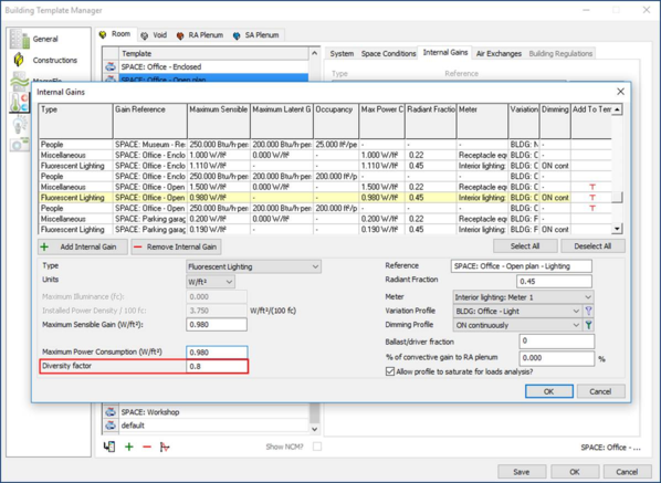 If internal gains are included in the loads analysis, then the user has the ability to include/exclude diversity factors as setup for each gain in either building template manager or Space Data as shown in Figure 2-4 .