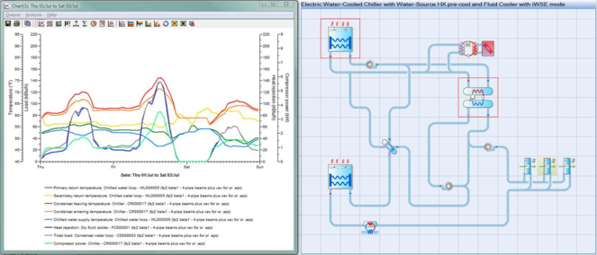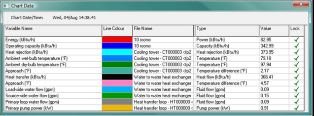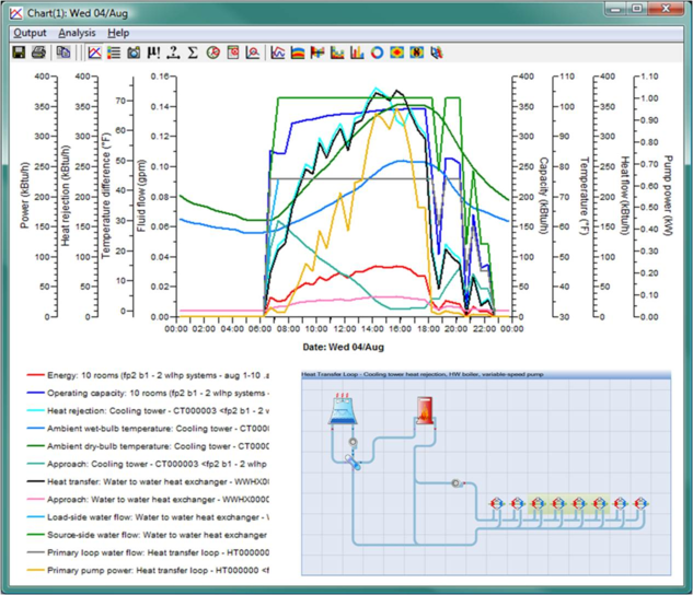 Figure 1 - 21 : Component variables can be locked via the Chart Data dialog (access by clicking the plot area) to include many details on a single plot. Above, energy and operating capacity for ten water-loop heat pumps have been plotted with select performance parameters for the heat exchanger and cooling tower used to reject heat from the heat pumps and the common heat transfer loop that couples them.