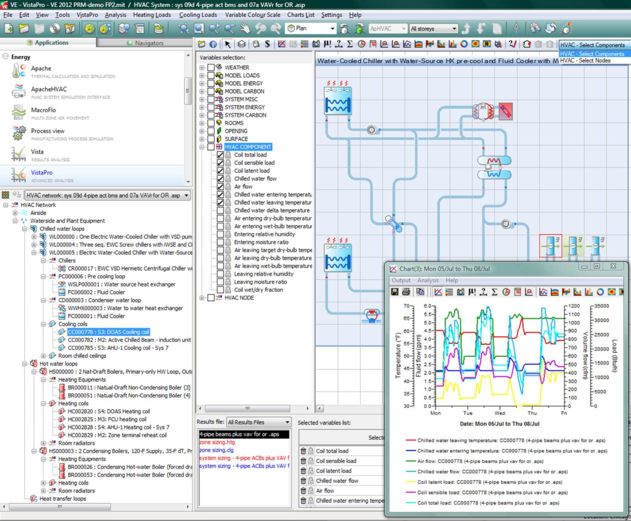 VistaPro provides access to all HVAC results, including those associated with thermal zones (rooms or other spaces in the model), nodes on the airside HVAC network, components on both airside and waterside networks, and all HVAC plant equipment.