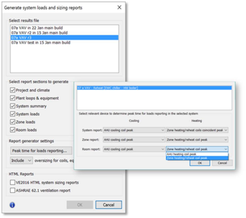 A consolidated “Generate system loads and sizing reports” dialog provides one place to generate a broad range of new and existing reports for buildings, system, zone, and room loads, sizing, and ventilation. This provides user control over: