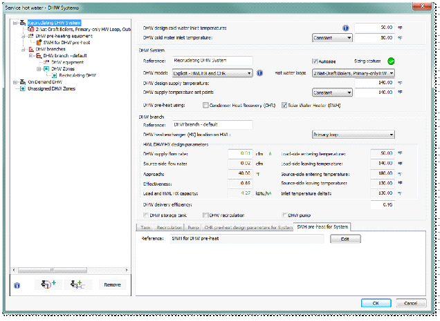 The Service hot water – DHW Systems dialog shown in Figure 1-18 defines DHW Systems and DHW Branches on a tree on the left, with parameters to specify systems on the right. The tree allows drag-and-drop functionality to assign DHW Zones to DHW Branches. Multiple DHW Branches may be added to a DHW System using the add button at the bottom. Assigning DHW Zones to DHW Branches assigns DHW Zones to the associated DHW System. Multiple DHW Systems may be added to a project using the add button at the bottom. Only DHW Zones with a setting for demand at the DHW Zone level or containing Rooms with ApacheHVAC DHW demand will be shown in the DHW Systems dialog.