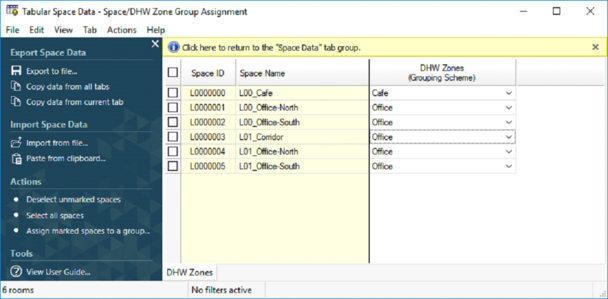 Once DHW zones have been created the user is required to assign spaces to these zones. This is achieved via the ‘Space/DHW Zone Group Assignment’ tab edit view.