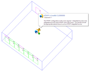 If a problem is detected with the room set-up (e.g. there was no valid louvre to attach to the HTM unit), then an exclamation mark overlay will be displayed at the top-right of the Monodraught logo – if you hover over the exclamation mark with the select tool ( ) active, a balloon tip will be displayed to indicate the problem with the room. For example: