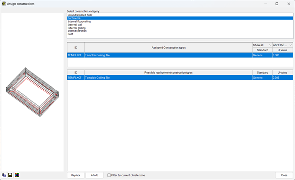 The new surface tile has been added into the assignment dialog within Apache view. As the Armstrong Templok PCM tile is the only construction in this category, once a surface tile has been added, the Armstrong Templok construction is automatically assigned to the model.