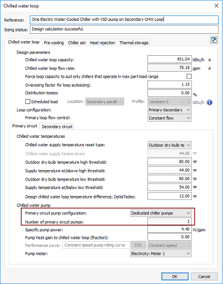 Default chilled water loops for PRM Baseline Systems in ApacheHVAC are primary/secondary configuration with constant flow on the primary loop. The primary loop has a specific pump power of 4.4 W/gpm with the pump riding the pump curve and the secondary loop has a specific pump power of 17.6 W/gpm with a variable speed curve. When the cooling capacity of the baseline building is less than 300 tons, users will need to change the pump performance curve on the secondary loop to constant speed using the pull-down menu in the Chilled water loop dialog.