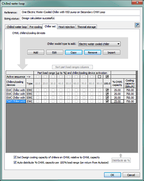 If the peak cooling load in the baseline building exceeds 300 tons but is not larger than 600 tons, users can add a second chiller to the chilled water loop by using the Copy button on the Chiller set tab of the Chilled water loop dialog. Both chillers will need screw curve sets (not the default centrifugal curves) so it is recommended that this change be made prior to using the Copy button. Users should ensure that the chillers are equally sized and can do so quickly by setting the % CHWL capacity to 50% for each chiller.