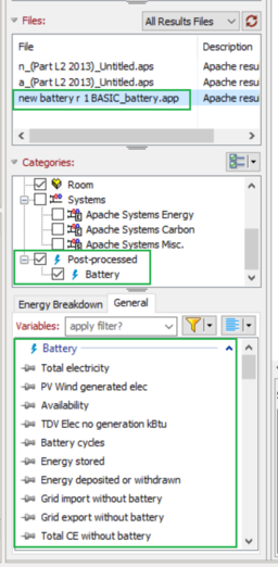 when selected the .app Battery variables can be chosen and plotted in VistaPro to view Building electricity demands, model Electricity generation, battery operation details and electricity drawn from grid versus exported to grid.