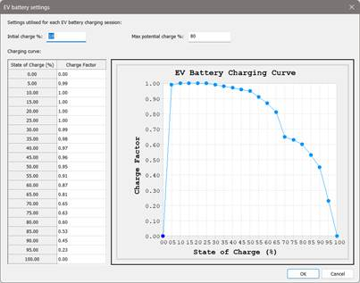 Charging curve: the characteristic charging curve for the EV battery. This curve describes how fast the battery can be charged (the charge factor) at the state of charge (%). The curve can be edited via the table or by dragging nodes on the chart. EV battery charging curves vary by vehicle; the default provided is typical / average.