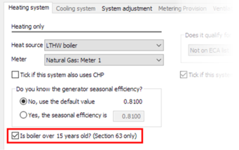 Where the building uses a boiler that is over 15 years old, you should check the Apache System the represents the boiler to mark it as such. This is done by opening Apache Systems, selecting the appropriate system and then clicking the UK NCM Wizard button. This will open the system wizard – on the Heating system tab, tick the Is boiler over 15 years old? (Section 63 only) checkbox if appropriate: