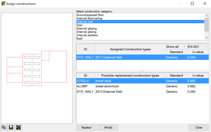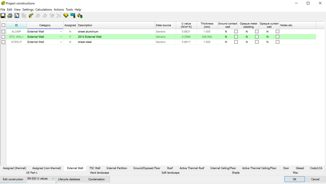 After you have selected a set of building elements you can change (or simply inspect) their construction types by clicking on the icon ‘Edit selection set constructions’ on the Edit toolbar.
