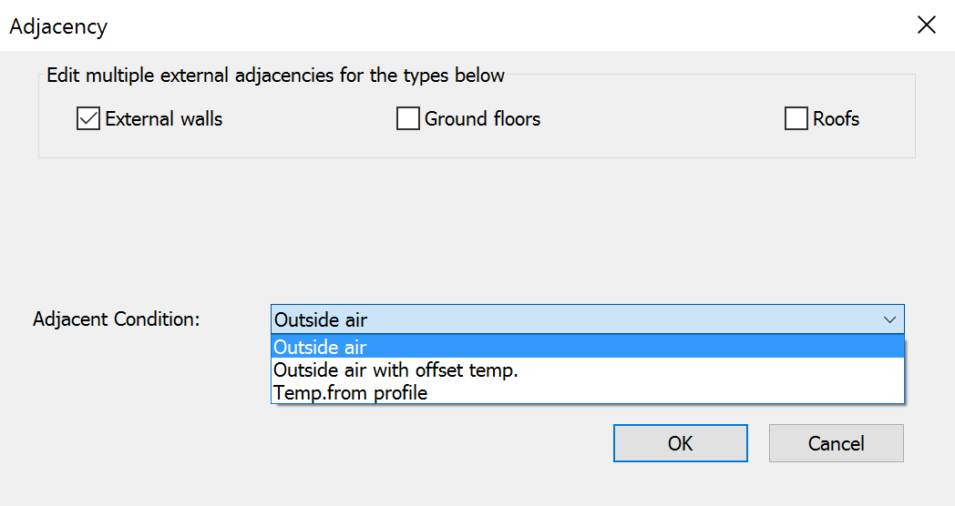 In all cases except partition wall and intermediate floor/ceiling, the Adjacency Condition may be edited. Possible Adjacency Conditions are: