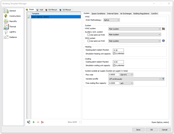 The BTM initially displays System attributes of a Thermal template applicable to spaces of type Room. Other types of template may be selected from the list on the left hand side of the dialog. Thermal templates for spaces other than rooms can be selected from the tabs at the top of the dialog (Room, Void, RA Plenum, SA Plenum), and other space attributes can be accessed using the tabs above the template data. These correspond to tabs on the Space Data dialog (System, Space Conditions, Internal Gains, Air Exchanges, Building Regulations, Comfort).