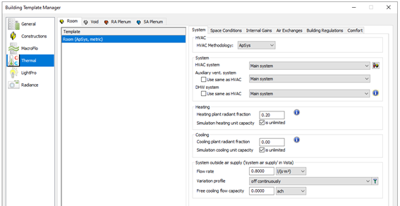 Room Templates contain data arranged on tabs under the headings; System, Space Conditions, Internal Gains, Air Exchanges, Building Regulations and Comfort. Not all this data is used in VE Compliance assessments, some being overridden by standard settings. It is therefore important to understand where and how the various components of Room Template data are used, refer to Space data section below.