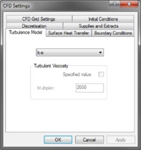 2. Constant effective viscosity: This model does not attempt to account for the transport of turbulence but offers the user a much faster, much more approximate method of accounting for turbulence than the k-e model. The turbulent viscosity is assumed constant throughout the calculation domain and it can be defined either by specifying an absolute value or a multiplier, which is applied to the molecular laminar viscosity. This specification of turbulent viscosity is at best approximate but does allow a number of scenarios to be investigated for key features, prior to using the k-e model.