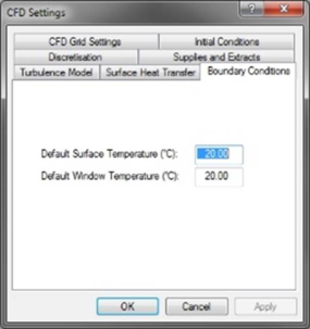 Here you can set the default temperatures for surfaces and windows respectively. Note that doors and holes are treated as surfaces vis-à-vis these settings. These need not be set if the boundary conditions are being imported from the VistaPro results.