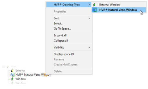 The HVR® Opening Type sub-menu will not be displayed if you have right-clicked on an item that is not an external door/window, or if you have right-clicked on an external door/window in a room that is not assigned to an HVR unit group.