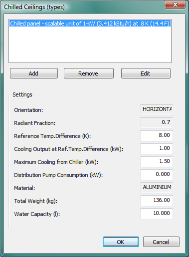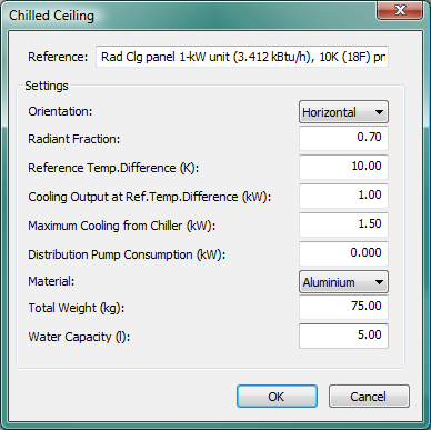 Figure 5 - 7 : Editing dialog with for pre-defined scalable (1-kW unit) overhead radiant cooling panel (the 1-kW capacity is matched at conditions in the Reference with the pre-defined scalable 4-kW heating panel).