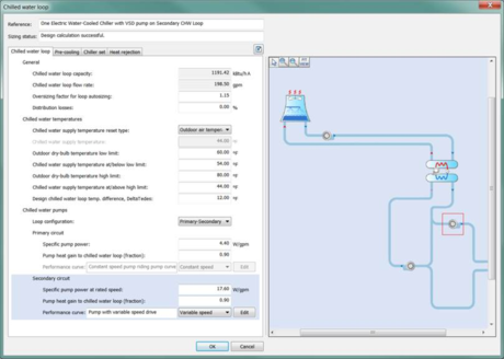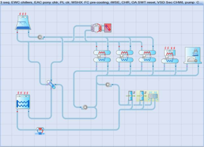 During simulation, chillers within a chiller set are switched in according to a user-specified sequence. During autosizing, sequenced chillers and the associated heat rejection plant and water flow rates are sized on the basis of user-specified percentages of the peak design load. Whether chillers are autosized or manually sized, the sizing of heat rejection equipment on the condenser water loop is always tied to the set cooling capacity of the chiller(s) that will operate maximum sequence load range. When electric-water-cooled chillers are included, and thus there is an associated cooling tower or fluid cooler, the chiller set may operate in waterside economizer mode (integrated or non-integrated modes are offered).