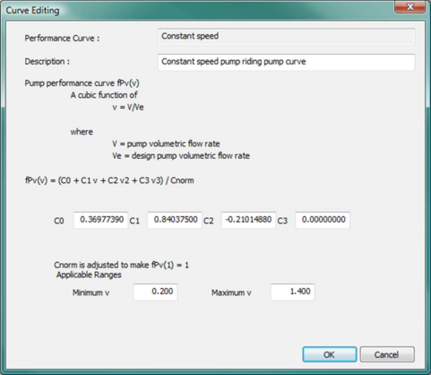 If the pump has a constant flow when it is on (the primary pump in the Primary-Secondary configuration ), this constant flow is multiplied by its specific pump power to determine the pump power. If the pump has variable flow (the primary pump in the Primary-only configuration, or the secondary pump in the Primary-Secondary configuration), i ts design pump power is calculated as the specific pump power multiplied by the design chilled water flow rate. The design pump power is then modified by the pump power curve to calculate the operating pump power at each simulation time step.