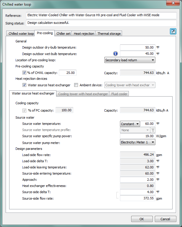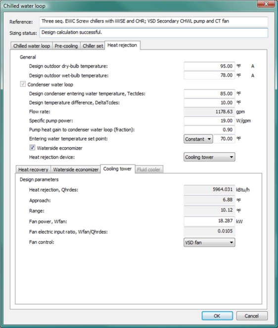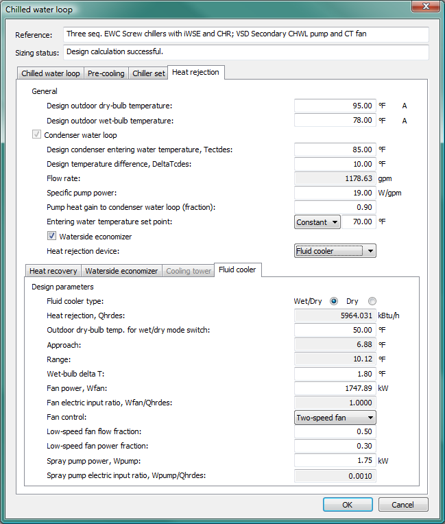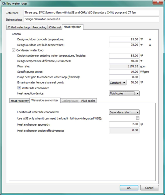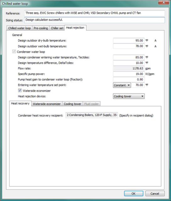 Heat rejection for water-cooled chillers is through an associated condenser water loop, for which an integrated waterside economizer is also available. Air-cooled chillers use only the design temperatures (DBT and WBT) for heat rejection. Heat rejection for the generic part-load-curve “chiller” type is described by the user via any combination of COP values, pump power, and fan power (all or any of which can be included in a composite COP) in the dialog for that type of equipment.