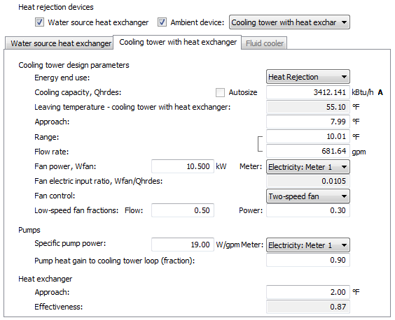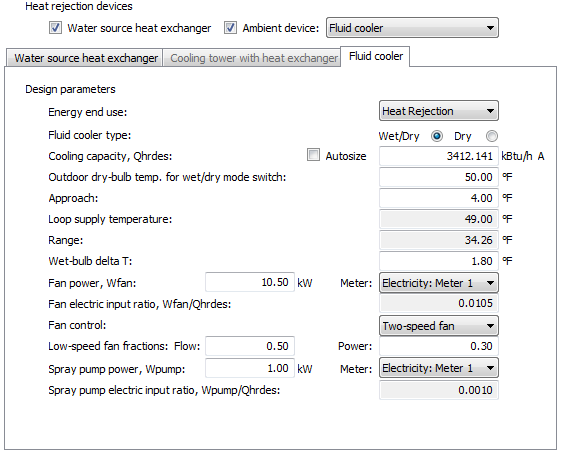 Select from the available options for heat rejection devices. Presently, these include an open cooling tower model or a closed-circuit fluid cooler. The open cooling tower model here is based on the Merkel theory, which is same as that used for the Dedicated waterside economizer component (see that section of the User Guide for details). The fluid cooler can be either wet, dry, or switch from wet to dry operation when outdoor temperature drops below a set threshold.