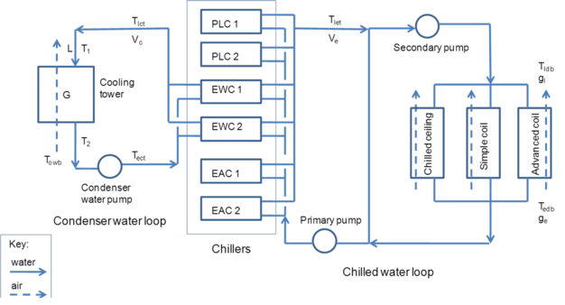 An optional condenser water loop is associated with each primary chilled water loop. This includes a cooling tower or fluid cooler model and is required only when the chiller set includes an electric water-cooled chiller (similarly, if a condenser water loop has been defined for a chilled water loop, at least one electric water-cooled chiller must also be defined for the same chilled water loop). An integrated waterside economizer is also available for condenser water loop systems.