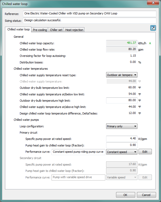 Chilled water and condenser water pump heat gains are modeled according to editable pump motor efficiency factors. Distribution losses from pipe work are considered as a user-specified percentage of the chilled water loop load.