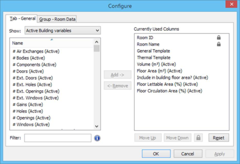 You can manage the columns in the active tab using this window – the name of the tab is indicated at the top. The right-hand list shows the columns currently included in the tab, while the left-hand list shows all other columns that are available. Due to support for viewing the same column in different variant building models, the list of available columns is large – you can filter it to only show you the columns for a particular model variant by using the Show dropdown above the list.