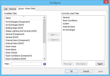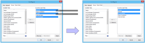 You can manage the tabs within the active tab group using the second tab of the Configure dialog – the name of the tab group is indicated at the top. The right-hand list shows the tabs currently included in the tab group, while the left-hand list shows all other tabs that are available.