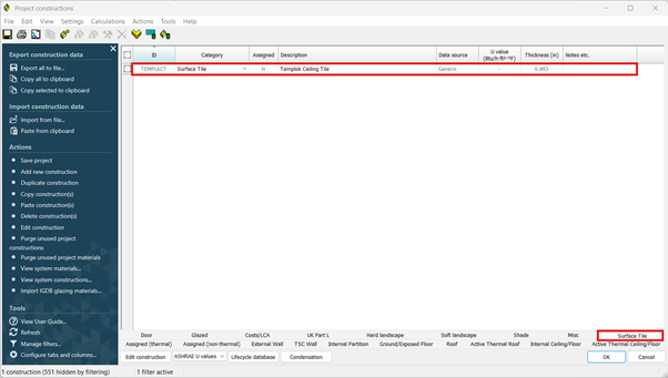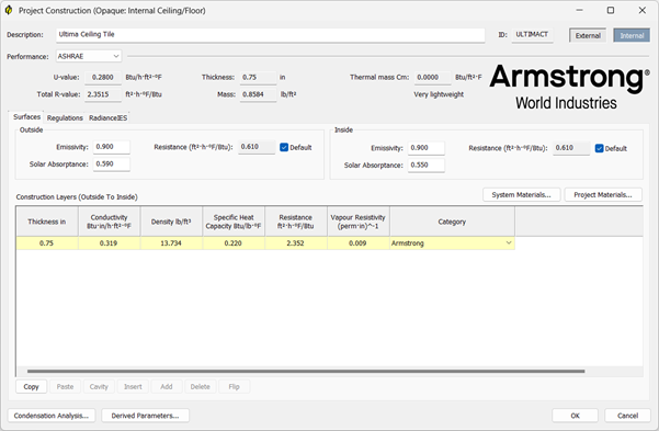 Once a surface tile has been added to the model the Armstrong Templok construction is imported into the surface tile category in ApCDB.
