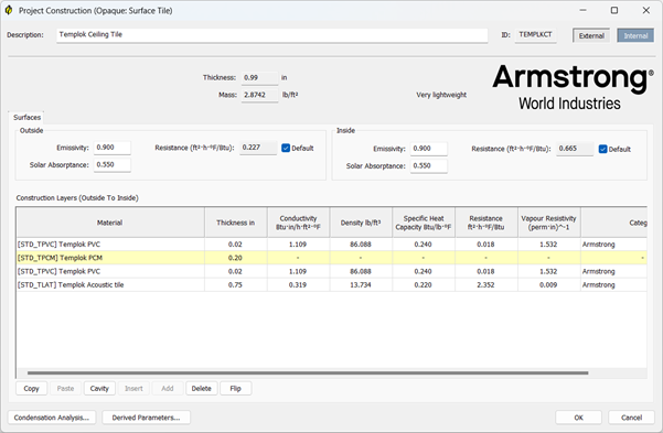 The key layer in this makeup is the Templok PCM. This is the Armstrong phase change material and has specific properties that are not shown in this dialog.