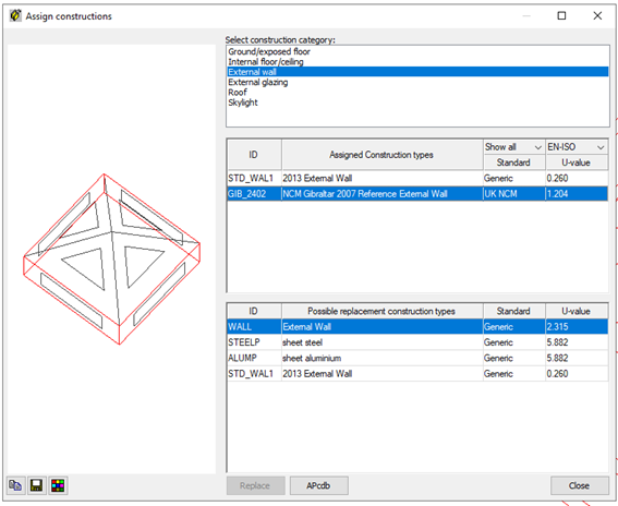 Upon selection of room(s) within the compliance geometry viewer, users can check NCM constructions programmatically assigned to the Reference building by selecting the “Assign constructions’ button.