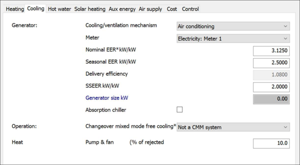 Operation When a system has the cooling/ventilation mechanism set to air conditioning the option to define an absorption chiller is available on the cooling tab. When this is selected the heating tab gives the option to define a CHCP system.