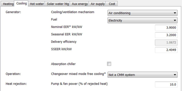 When a system has the cooling/ventilation mechanism set to air conditioning the option to define an absorption chiller is available on the cooling tab. When this is selected the heating tab gives the option to define a CHCP system.