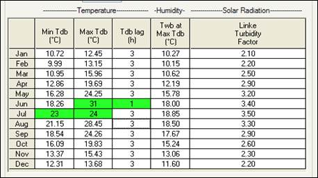 Custom weather files can be created by modifying the individual values of existing files. Once modified the data values turn a green colour to indicate that a change has been made. To do this, for the parameters common to both CIBSE and ASHRAE for each month from January to December inclusive, the following data are required: