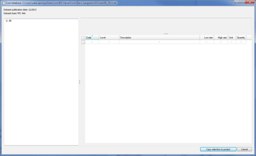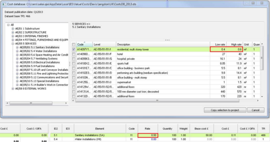 Once selection has made, click the button “Copy selection to project” return the aggregated low rate * quantity of all selected items, the aggregated high rate * quantity of all selected items and the cost database source back to the current object.