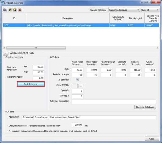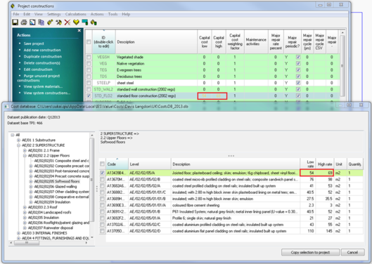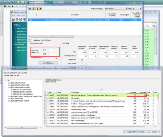 Each opening of the cost database will be corresponding to the underlying object: either the current construction, or the current material (floor finish / suspended ceilings), or the current system, or the current cost plan element / sub-element.