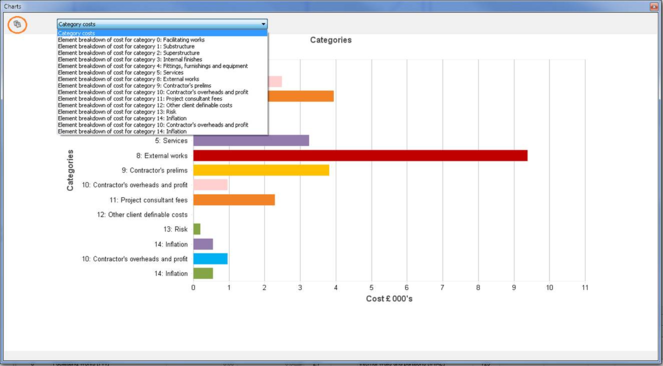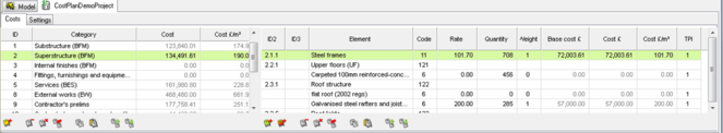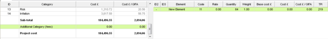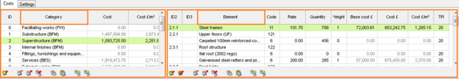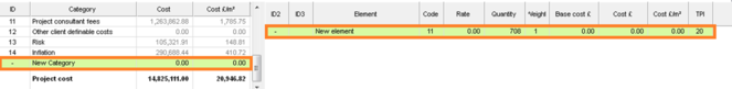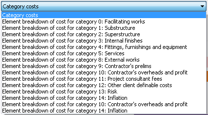 Within each cost plan exists a list of categories, which is then broken down into elements and subsequently sub-elements. The category list is displayed on the left and the element list is displayed in the right of the image below. The user can switch between each category which will result in the elements contained within the selected category being displayed in the element list to the right.