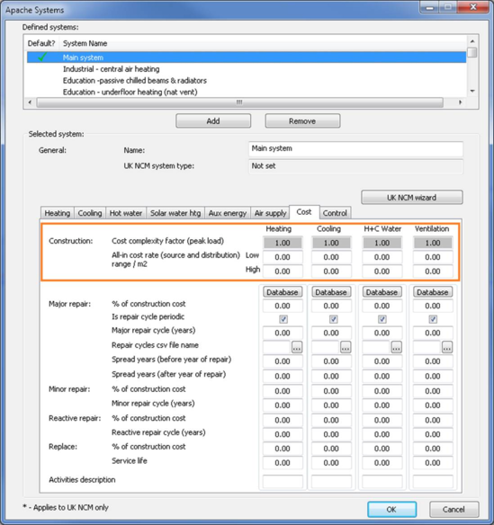 Rate: this field displays the rate used for the cost calculation. Where cost data has been previously assigned to constructions/systems etc. via either the CDB dialog or the Apache systems dialog, the module will refer to an auto sub-element to retrieve the rate cost. An auto-sub element as the name suggests, will retrieve the cost data that has already been assigned to either a system type or construction type. For example the CDB manager dialog shown below. User entered rates will be colored blue. By right clicking the combo box, the user will have the option of using automatic rates, or manually entered rates. This is an editable field. When pricing components or PVs which do not have relevant costing interface, this field is used to fulfill this purpose.