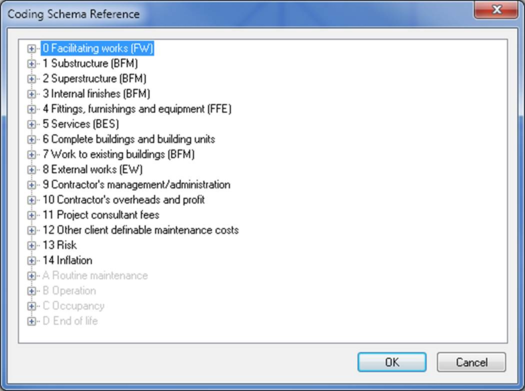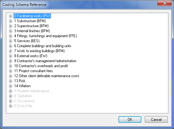 This is a NRM based coding schema. Select any item in the above tree then click OK which will allow the id and name of the selected item pop into the id and name column of the currently selected category. The greyed out items are not available for this module. They are used by LCC and LCA modules.