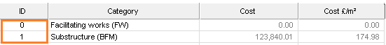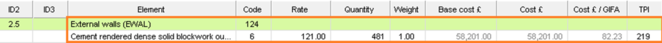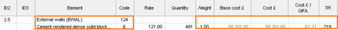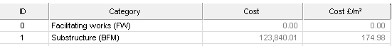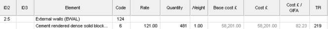 For example code “124. External Wall by CDB item rate & area” instructs the module to process all external wall constructions assigned in the model and retrieve their rate and quantity to calculate the associated construction costs. Each external wall construction in the model will be displayed as a sub-element. Construction name will be the name of the sub-element.