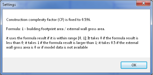 This will display the construction complexity factor (CF) used for cost calculation – only used by element codes with CF in the description. For details on CF, please refer to section 1.2.1.1 .