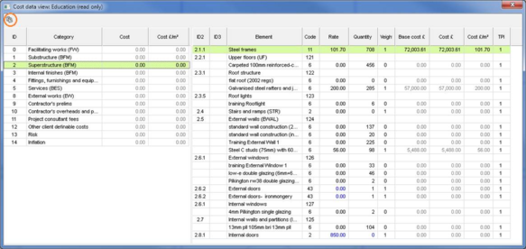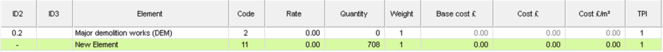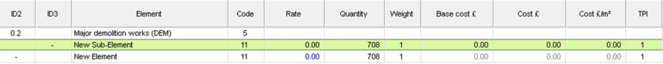 Cost £ / m2: This field is non-editable and displays the total construction cost of an element or sub element in m²