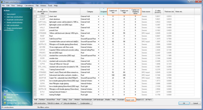 The Apache construction database manager (CDB) provides access to construction datasets and allows the user to edit or create constructions and materials. The high and low cost for each construction type can also be edited here. Once changes have been made and saved, the project will automatically update the capital cost with respect to any changes made by the user.