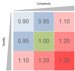 This allows the user to adjust the overall construction cost at project level according to the complexity and quality of the project at hand. Three levels of complexity and quality are available which gives 9 combinations, each combination links to a factor in the following 3 by 3 metrics.