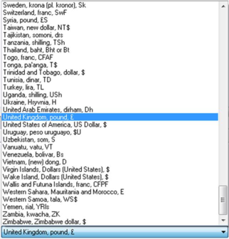 The currency combobox provides a list of countries and their currency. Selection of an item will lead to changes of the currency labels display in the cost plan headings. However, this will not lead to a conversion of costs and therefore will not change the rates and costs figure.