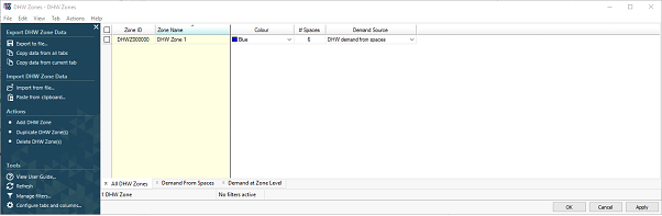Users can add zones via the ‘Add DHW Zone’ action from the left hand menu of the DHW zones tab edit view. The properties of the zones can then be edited e.g. names, etc.