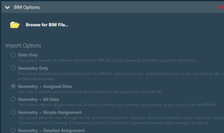 The Create From BIM File sub-section can be used to create a new project that includes geometry and/or data from a Building Information Model (BIM) file in gbXML, IFC or veXML format.