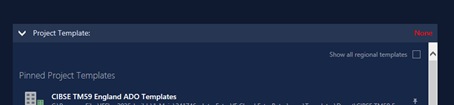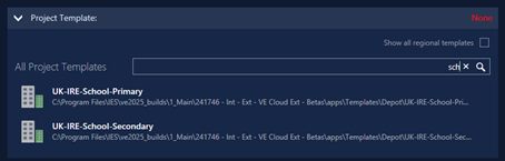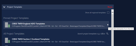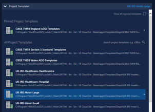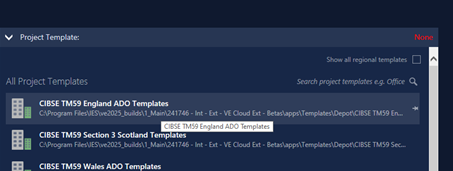 The Project Template group will list all available project templates in its All Project Templates list – this will include IES-supplied project templates for different building types (e.g. Hotel, Office) appropriate to the current region (derived from your PC’s locale settings), and any user-created project templates (see below). You can view the IES-supplied templates for all regions by clicking the Show all regional templates checkbox at the top-right of the group.