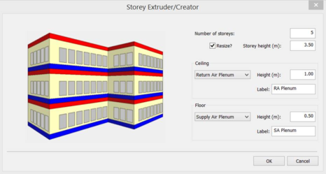 The Storey Extruder/Creator tool is a facility for creating a set of storeys as copies of a selected space. The copies will be stacked on top of the existing space and may be subdivied to create ceiling and floor voids or plenums.